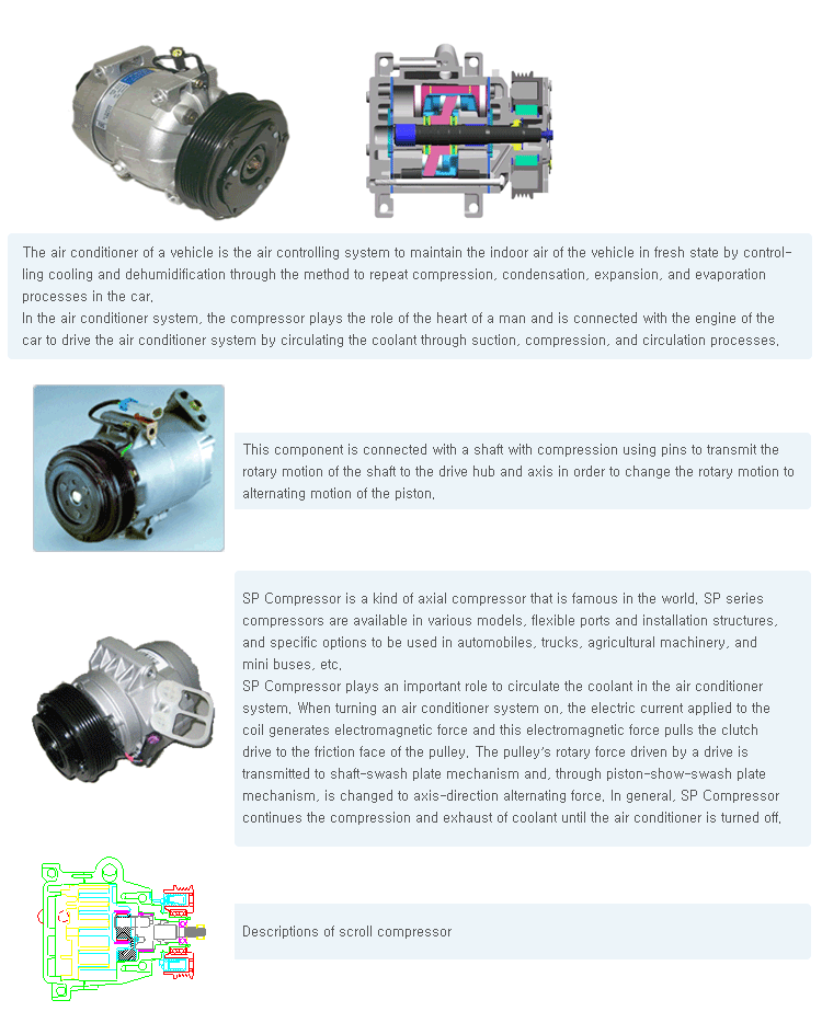 Greetings | Vision / Mission | Company Overview | History | Organization | Patents and Certification | Map | Compressor components | Start motor components | Power steering components |